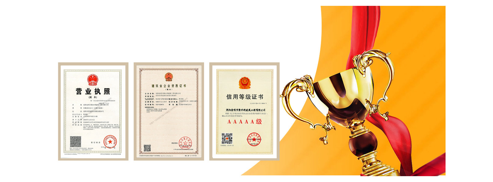 我公司先后受到遼寧省建筑業(yè)協(xié)會(huì)的好評(píng),遼寧省及沈陽(yáng)市工商局頒發(fā)的重合同守信譽(yù)企業(yè)稱(chēng)號(hào),勞動(dòng)保障監(jiān)察書(shū)面誠(chéng)信等級(jí)A,信用遼寧網(wǎng)站公示AAA等級(jí),信用沈陽(yáng)網(wǎng)站公示AAA等級(jí),水利安全生產(chǎn)標(biāo)準(zhǔn)化二級(jí)單位,中國(guó)水利工程協(xié)會(huì)信用AAA等級(jí),
